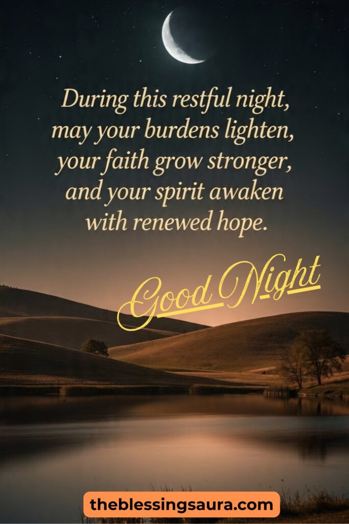 During this restful night, may your burdens lighten, your faith grow stronger, and your spirit awaken tomorrow with renewed hope.